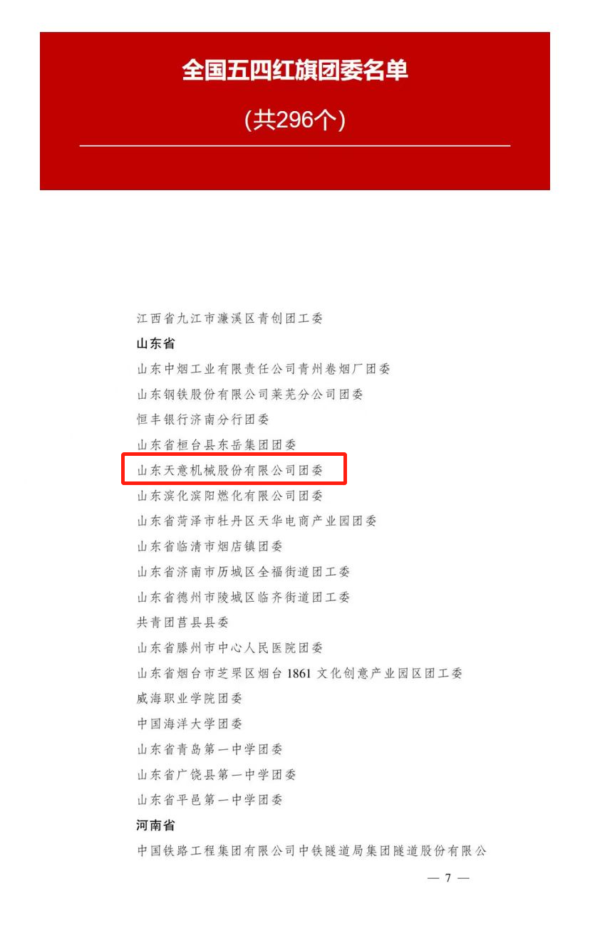 喜報丨天意機械團委榮獲“全國五四紅旗團委”稱號