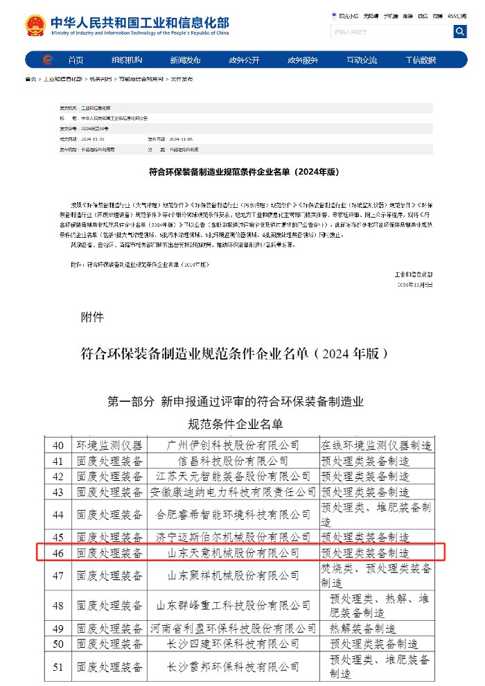 喜報丨天意機械入選工信部環(huán)保裝備制造業(yè)規(guī)范條件企業(yè)